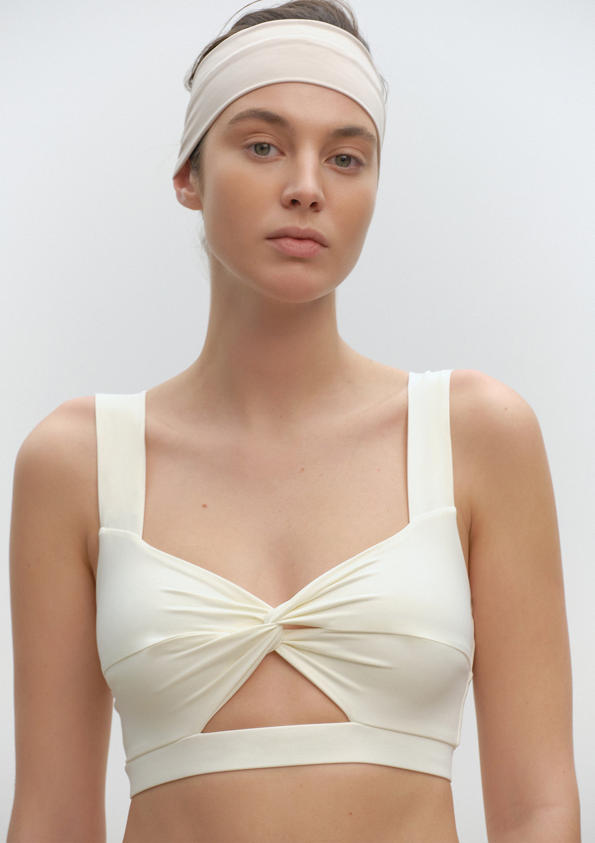 - A ruched bra designed with wide shoulder straps and an under-bust elastic for medium support