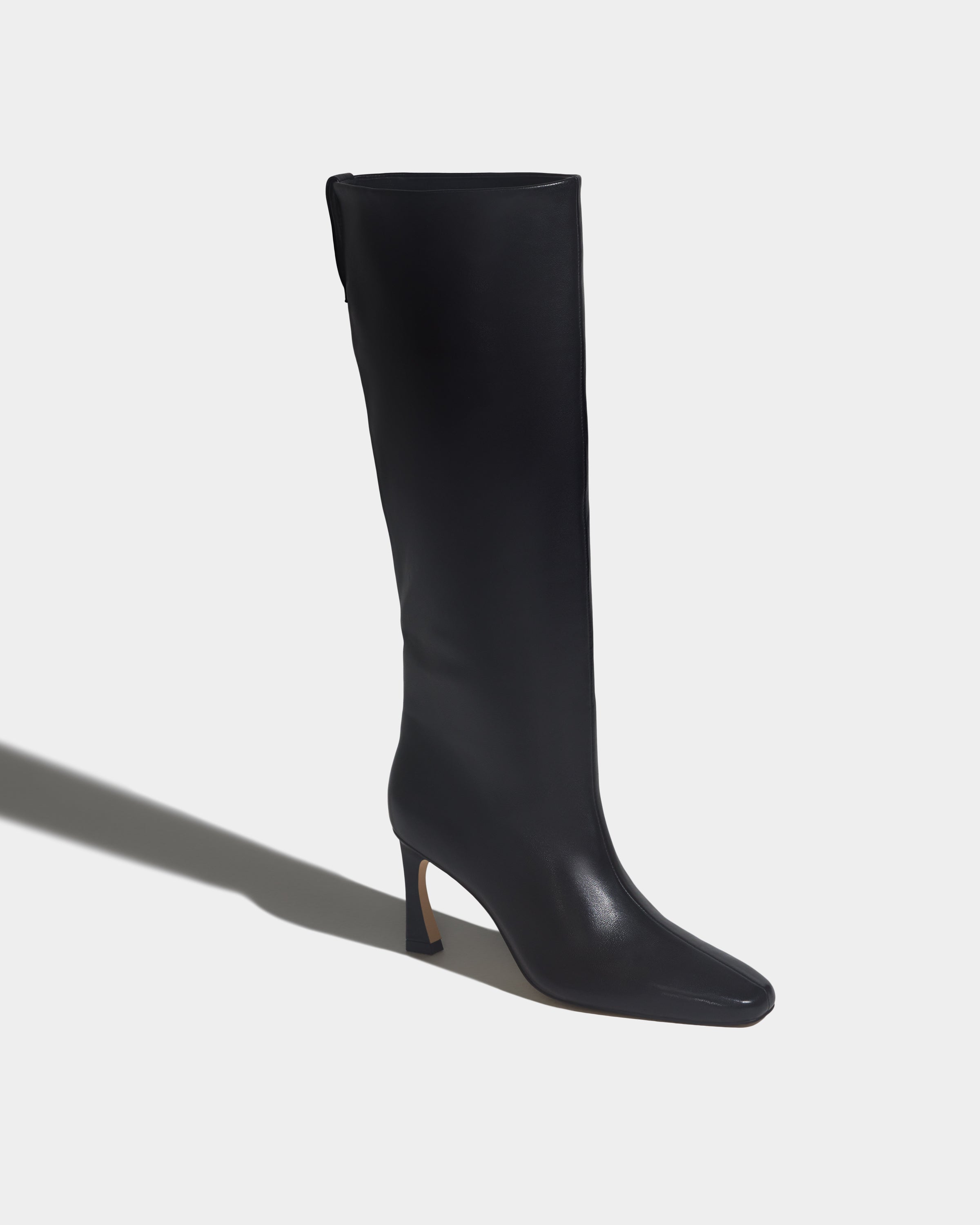 - Bold knee-high boot crafted in leather with a sleek pointed toe and slim heel