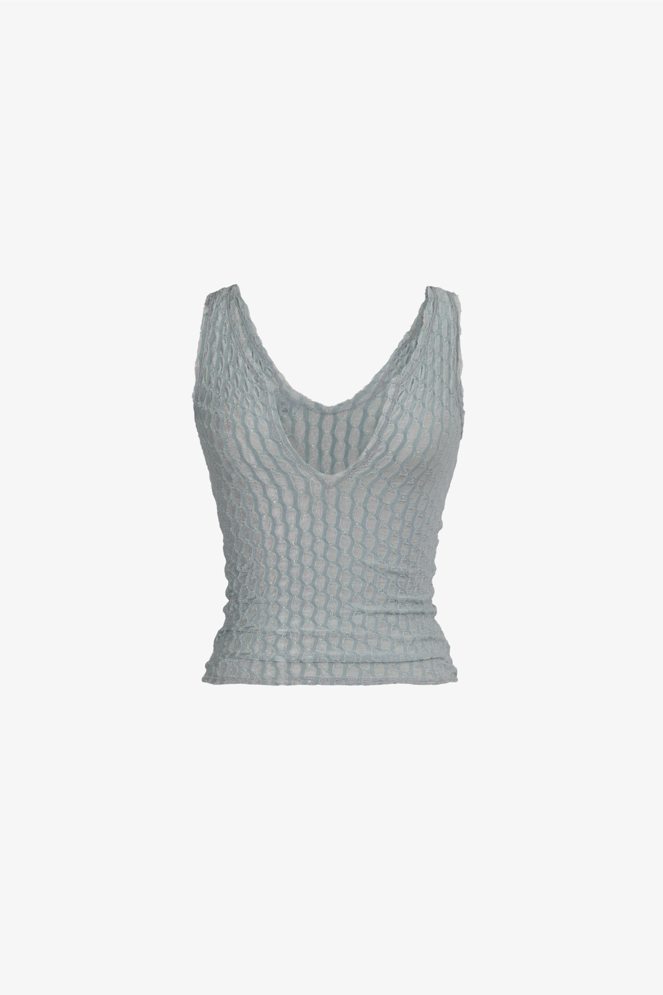 A baby blue knit tank featuring an oval stripe texture with a subtle sheen - reminiscent of dew drops. Styled with the Liu Capri in Cream.
