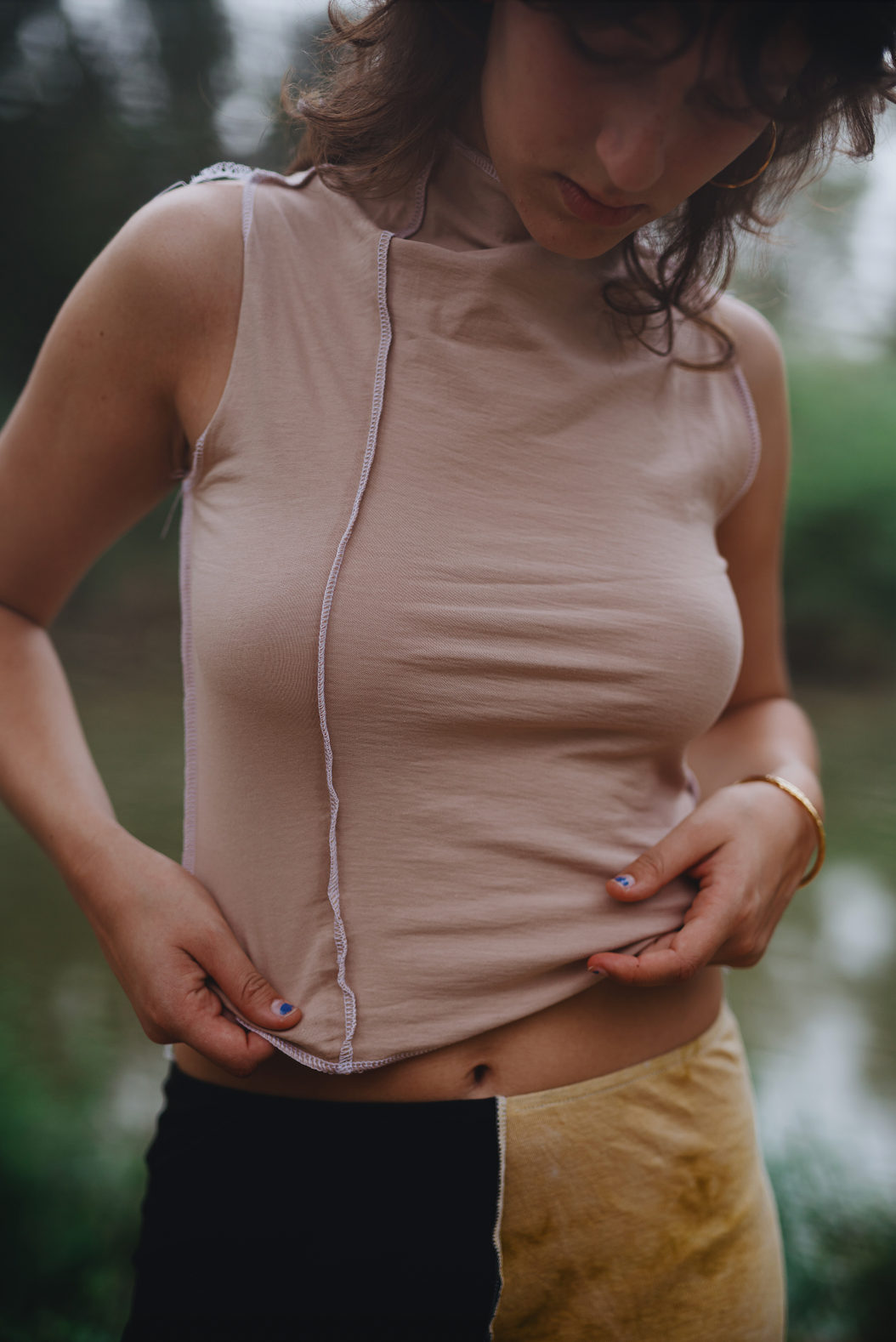 A softly structured tank with a draped neckline and exposed overlock seams for a raw, considered finish. Made entirely from upcycled local factory waste, each piece carries subtle variations that make it uniquely its own. Selected for our Independent Studio edit, celebrating designers who create independently, with intention and a unique point of view.