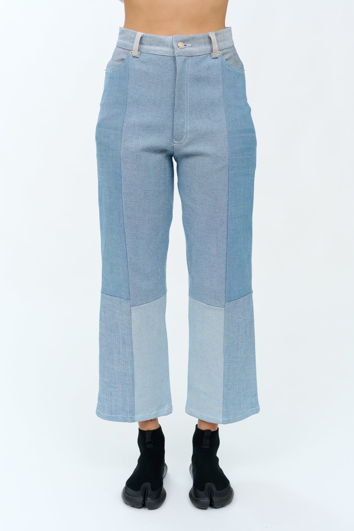 Upcycled unisex denim crafted from deconstructed second-hand jeans, featuring a mix of light to mid-tone washes. Designed with a high-rise waist and straight leg that hits at the ankle for a clean, versatile fit. Each pair is one of a kind, with natural variations in fabric and construction. Selected for our Independent Studio edit, celebrating designers who create independently, with intention and a unique point of view.