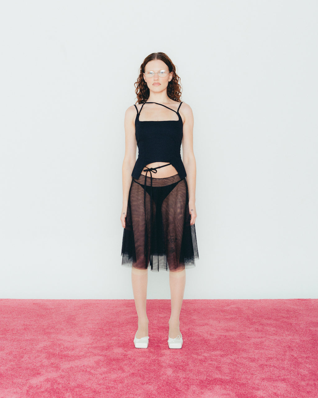 Form-fitting corset-style top featuring a lace-up back and 2 adjustable straps on each side for customizable styling